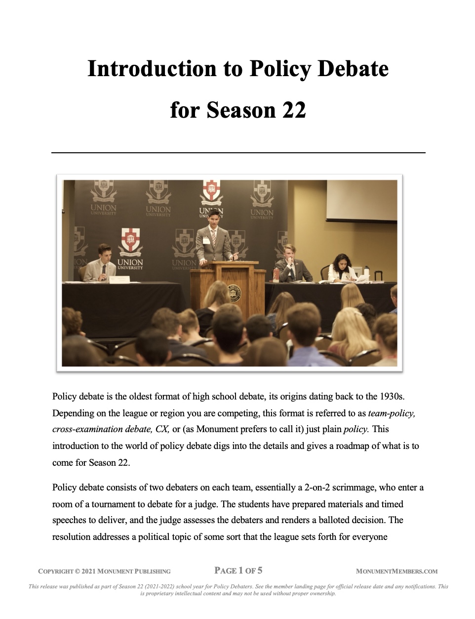 Policy debate is the oldest format of high school debate, its origins dating back to the 1930s. Depending on the league or region you are competing, this format is referred to as team-policy, cross-examination debate, CX, or (as Monument prefers to call it) just plain policy. This introduction to the world of policy debate digs into the details and gives a roadmap of what is to come for Season 22.